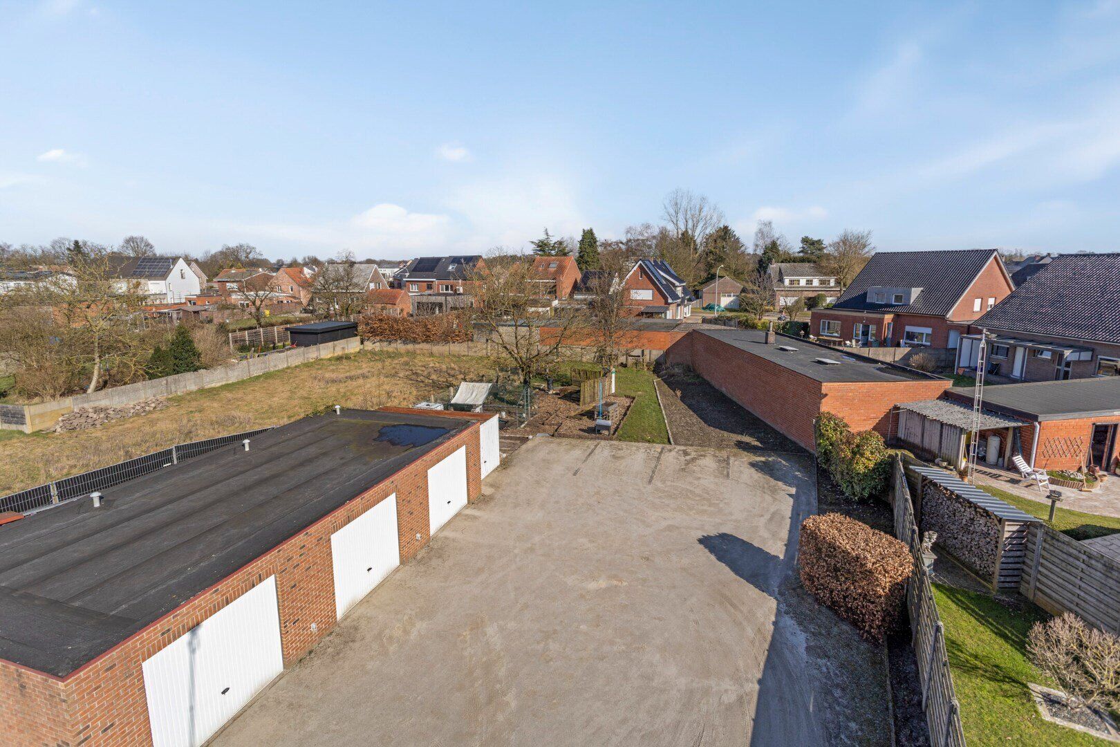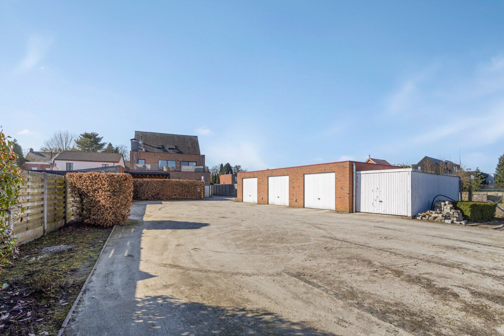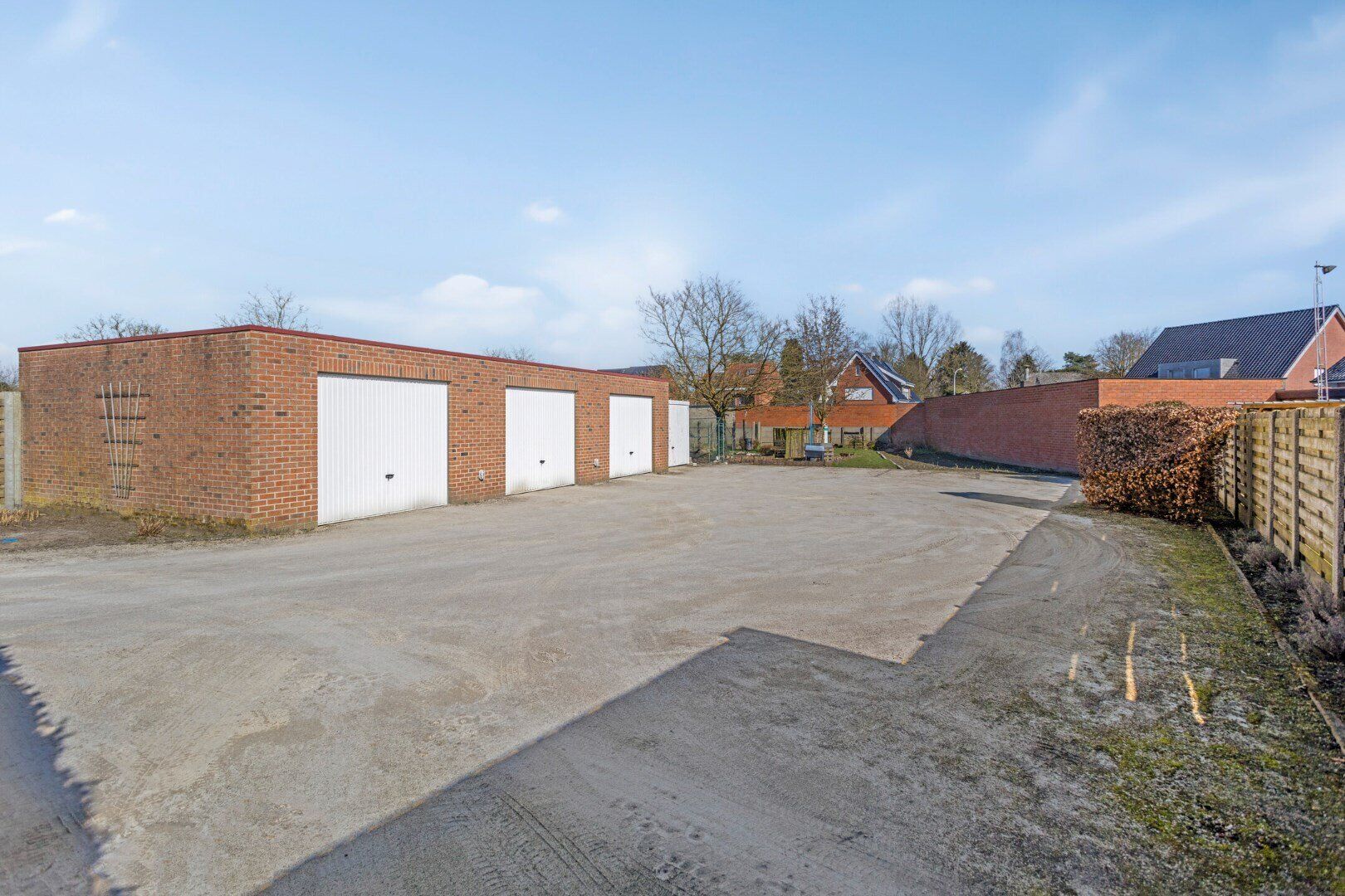 In de tuin zijn drie gemetselde ruime garages en een extra garagebox. Daarnaast is er nog extra parkeergelegenheid indien gewenst. De tuin is deels gemeenschappelijk.