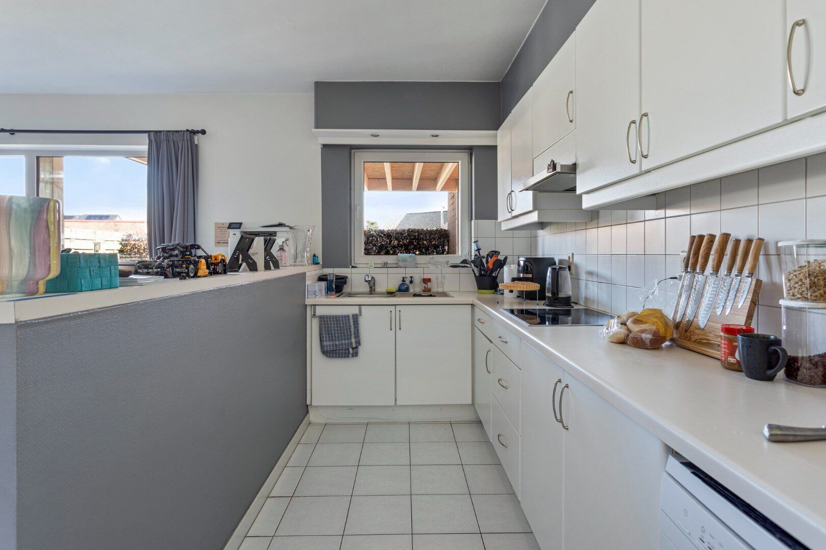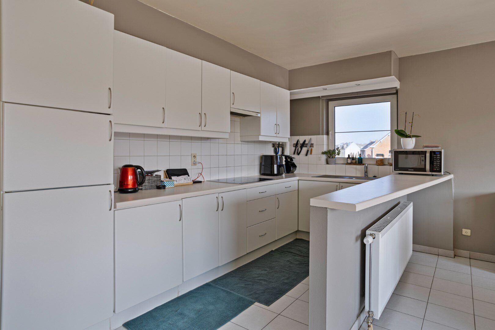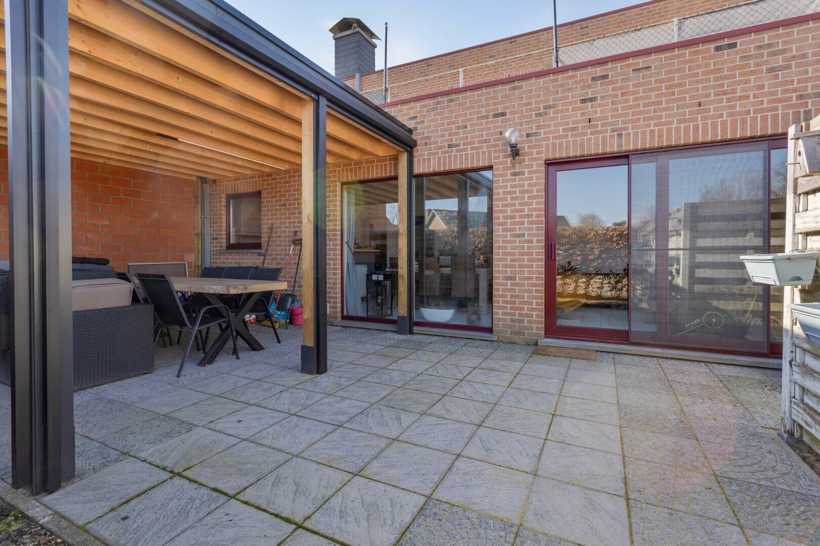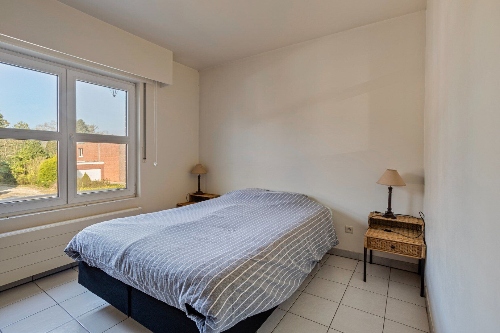 Aan de achterzijde bevindt zich een ruim appartement van 109 m². Via de inkomhal kom je in de lichtrijke leefruimte, die is ingedeeld in een zit- en eethoek met een open keuken, voorzien van alle comfort. Een schuifraam geeft toegang tot het terras en de aansluitende tuin. De nachthal leidt naar twee slaapkamers en een volledig betegelde badkamer met douche en een wastafel in meubel met kastruimte. Er is ook een aparte berging/wasplaats.