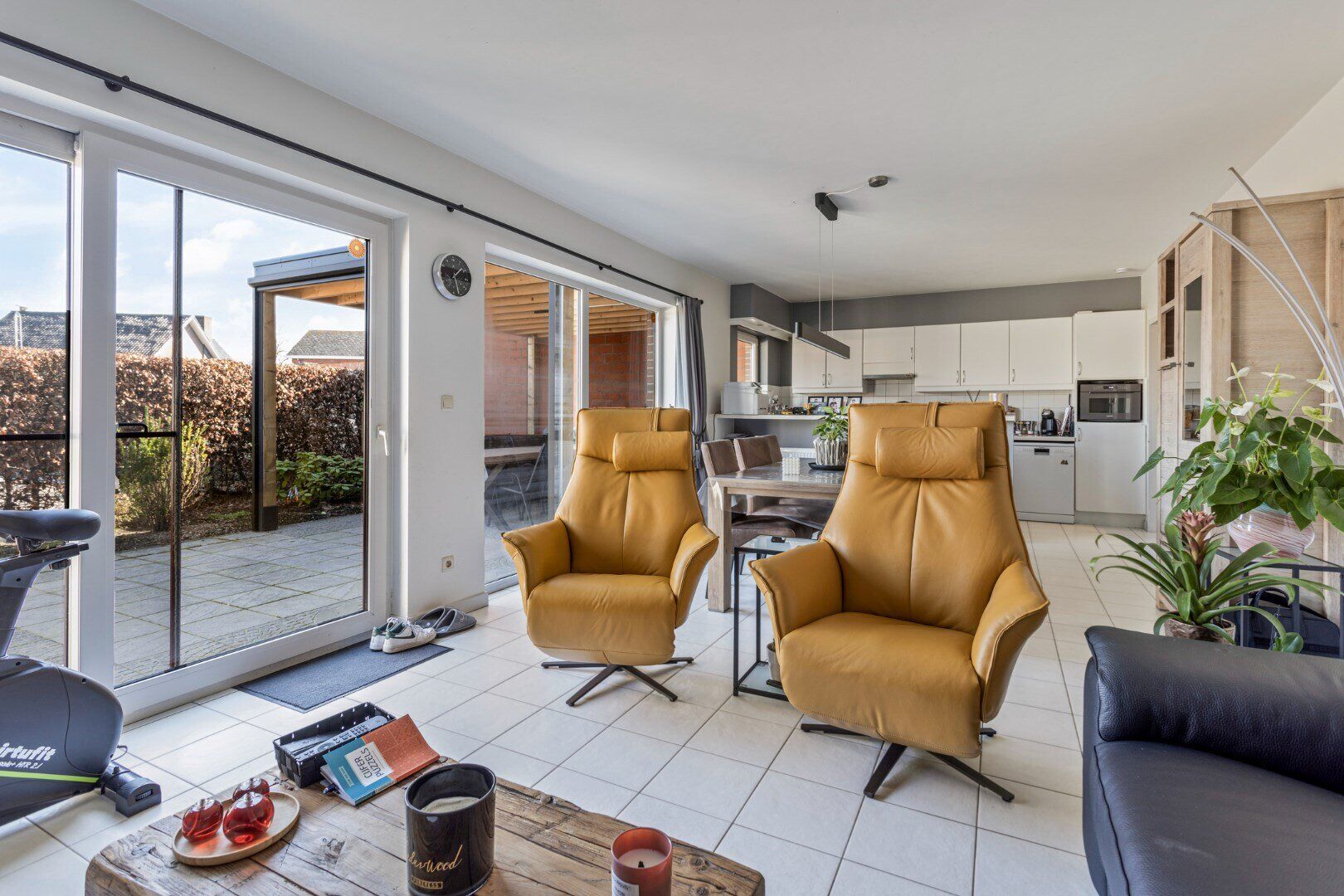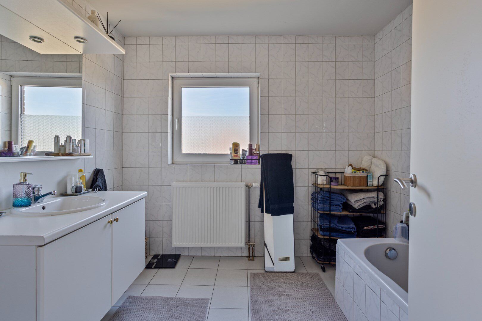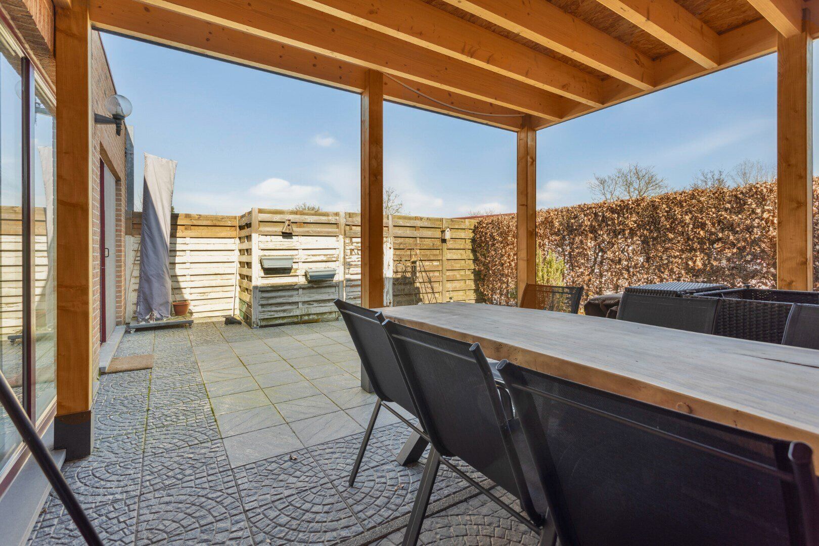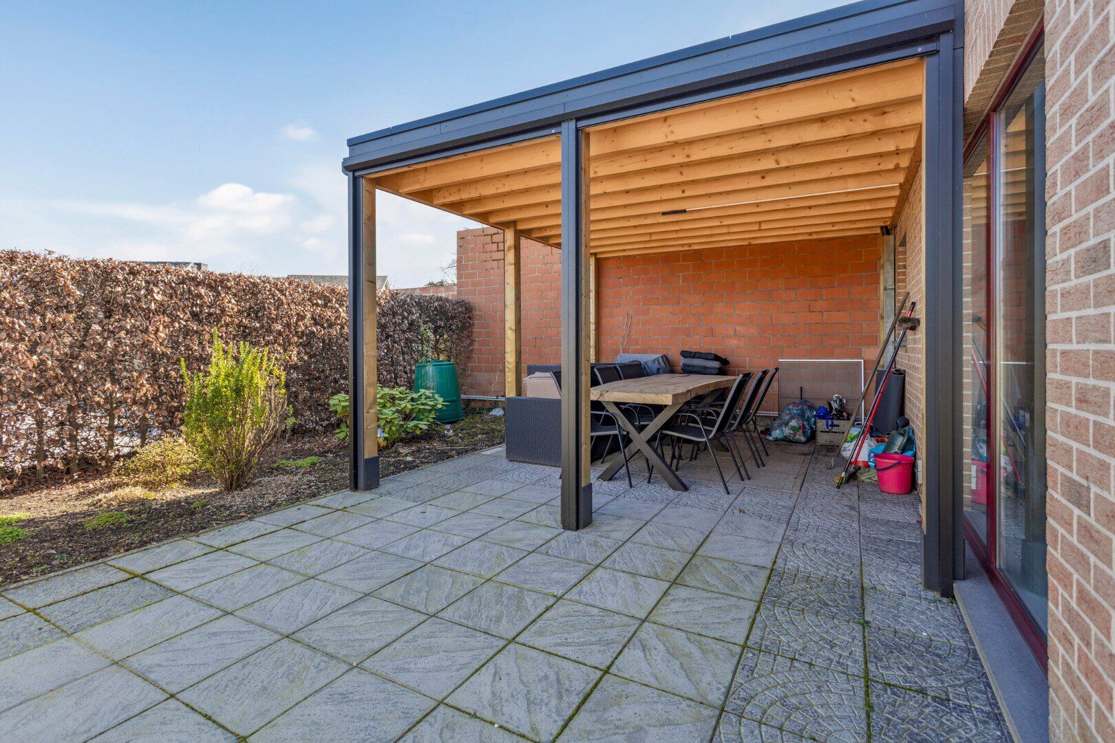 Aan de achterzijde bevindt zich een ruim appartement van 109 m². Via de inkomhal kom je in de lichtrijke leefruimte, die is ingedeeld in een zit- en eethoek met een open keuken, voorzien van alle comfort. Een schuifraam geeft toegang tot het terras en de aansluitende tuin. De nachthal leidt naar twee slaapkamers en een volledig betegelde badkamer met douche en een wastafel in meubel met kastruimte. Er is ook een aparte berging/wasplaats.