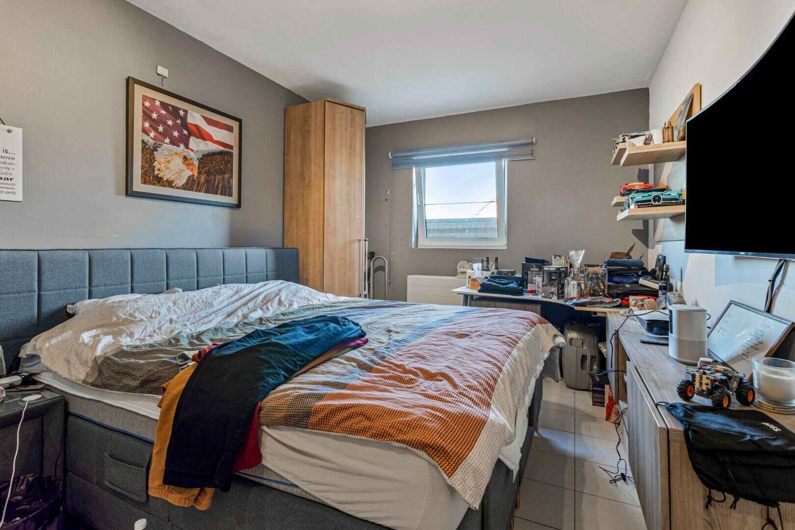 De studio op de tweede verdieping bestaat uit een zithoek, een eethoek en een open keuken, met veel natuurlijke lichtinval. De slaapkamer grenst aan een deels betegelde badkamer met douchebad, enkele wastafel in meubel en toilet.