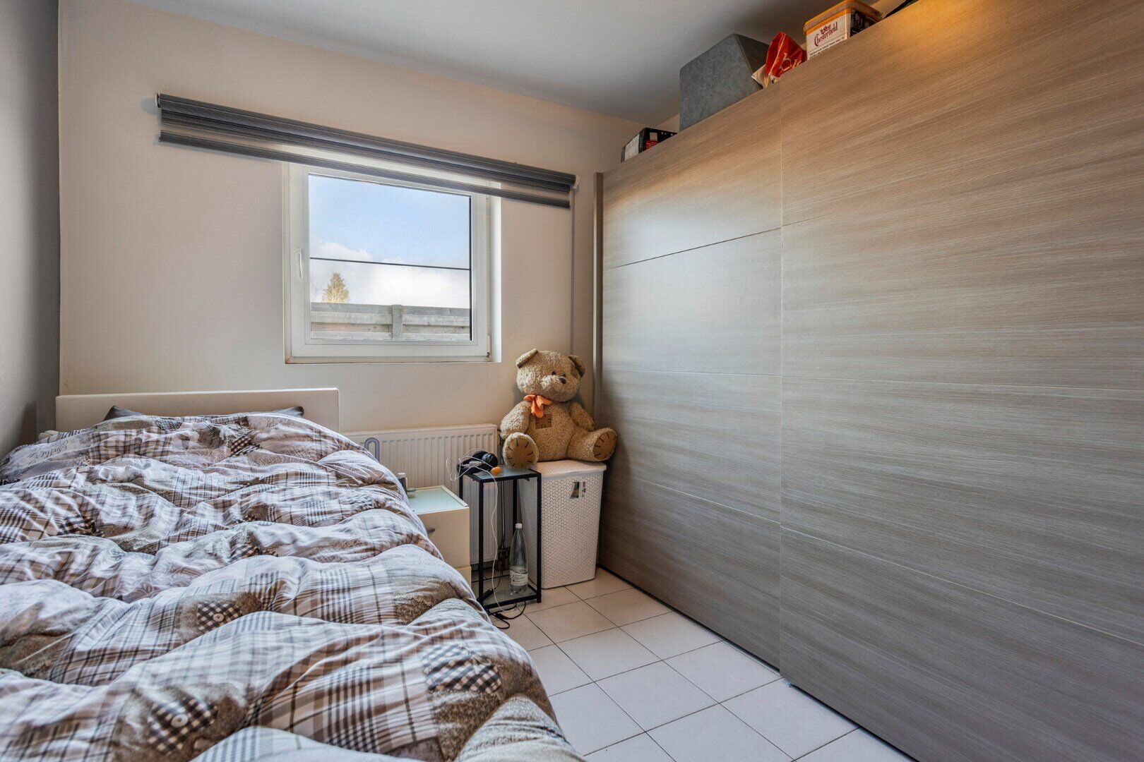 Het appartement op de eerste verdieping (114 m²) betreed je via de inkomhal met vestiaireruimte en gastentoilet. De woonkamer is ingedeeld in een zit- en eethoek met een open keuken. Een grote schuifraam geeft toegang tot het ruime terras, waar je volop privacy geniet. De nachthal leidt naar twee slaapkamers en een volledig betegelde badkamer met douchebad en enkele wastafel in meubel. Ook hier is er een aparte berging/wasplaats.