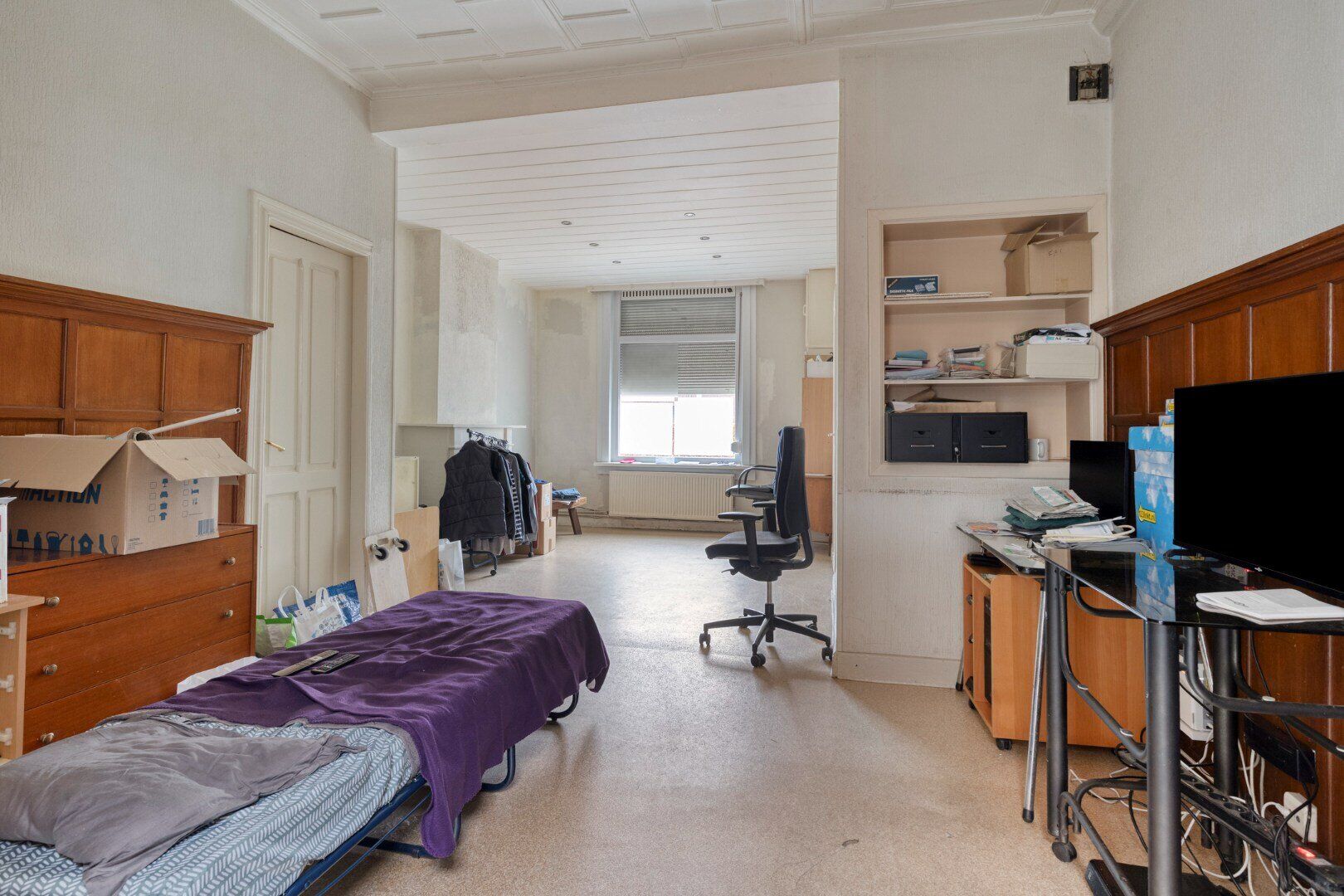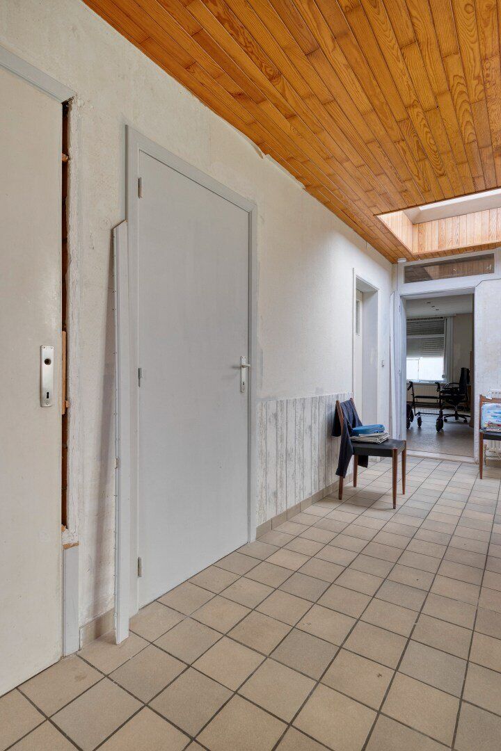 Op het gelijkvloers bestaat de woning uit een inkomhal, ruime leefruimte en een aanbouw bestaande uit een te renoveren keuken met voldoende ruimte voor een eettafel en een badkamer.