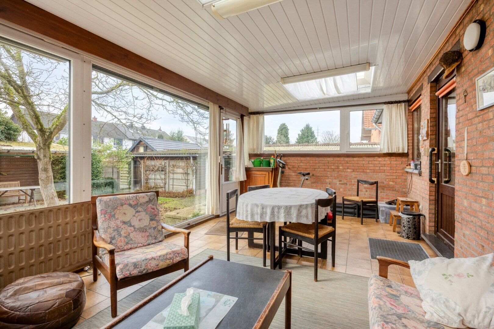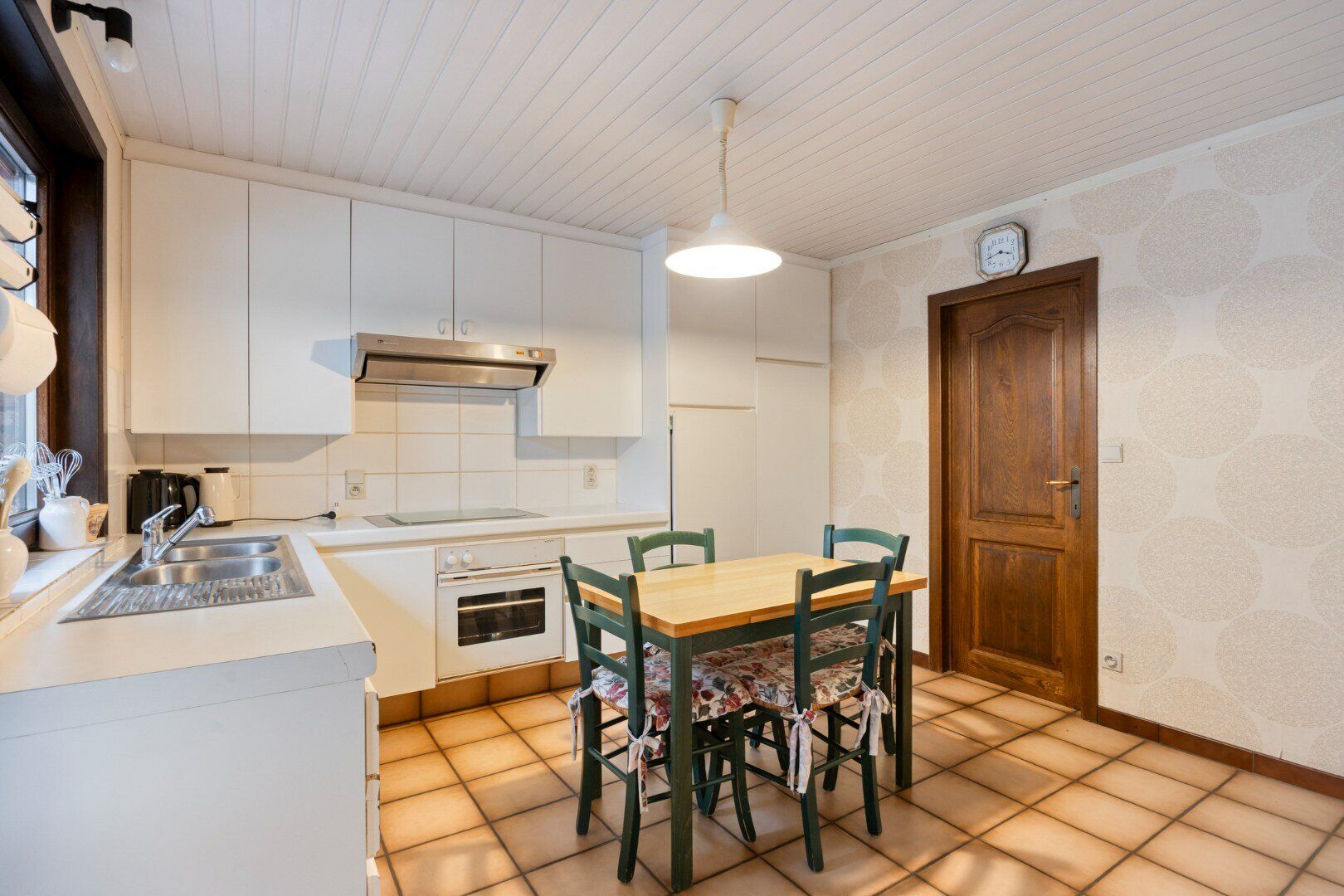 We betreden de woning via de ruime inkomhal met gastentoilet. Vervolgens komen we in de leefruimte met toegang naar de keuken en veranda. Deze keuken is voorzien van voldoende kastruimte, een ijskast, elektrische kookplaat, afzuigkap en wastafel. In de veranda kan je heerlijk vertoeven en genieten van zicht over te tuin.
