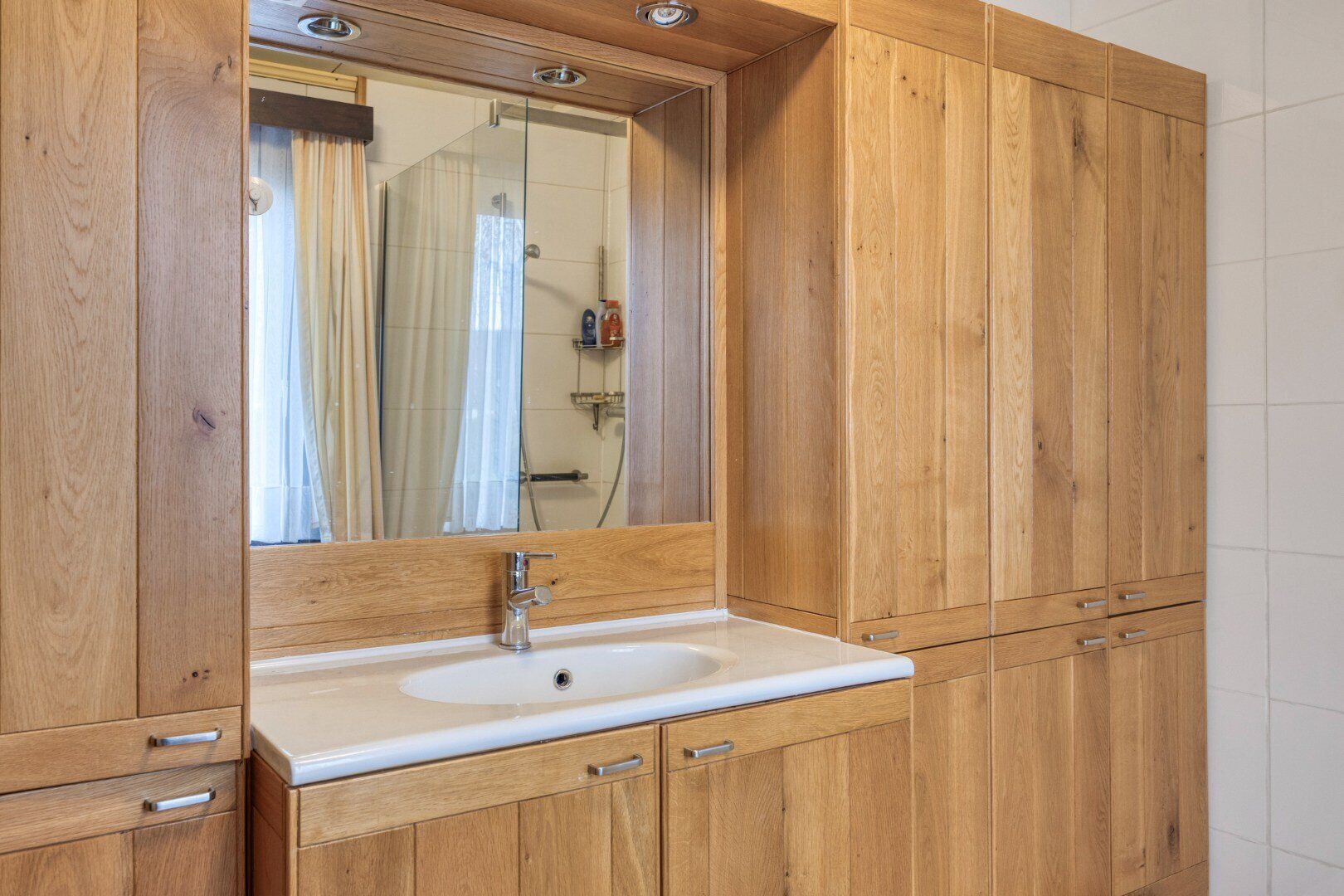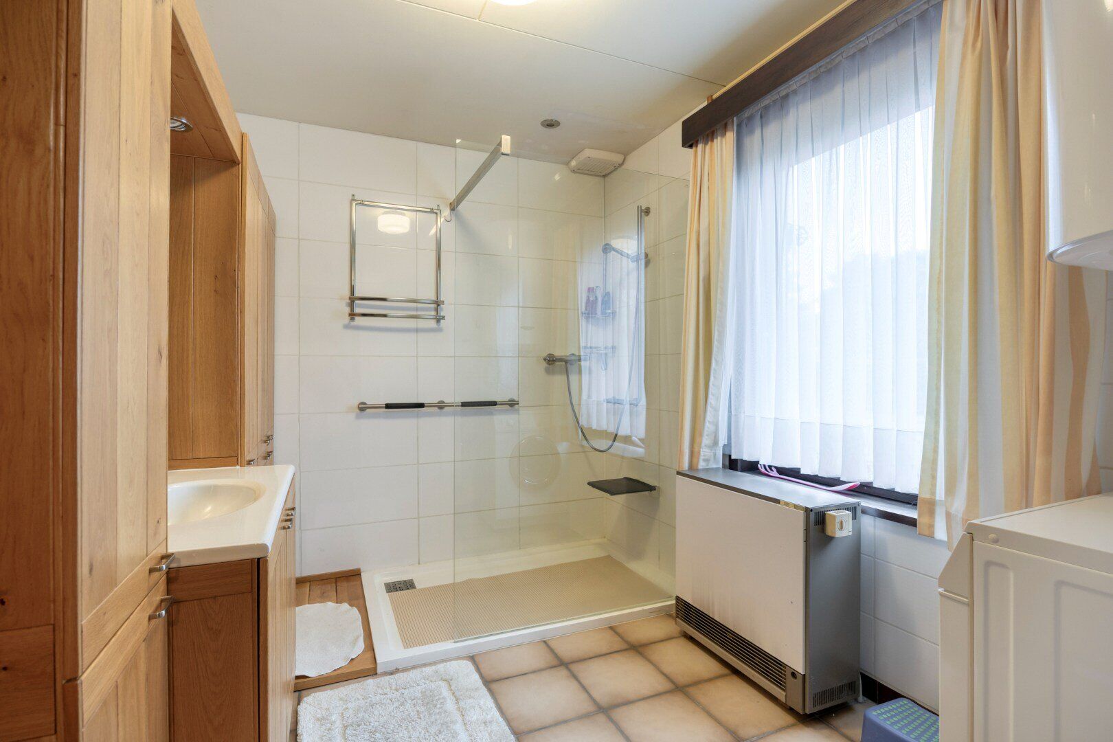 De badkamer en de eerste slaapkamer zijn tevens op het gelijkvloers. De badkamer is voorzien van een lavabo in meubel, douche en aansluiting voor wasmachine.